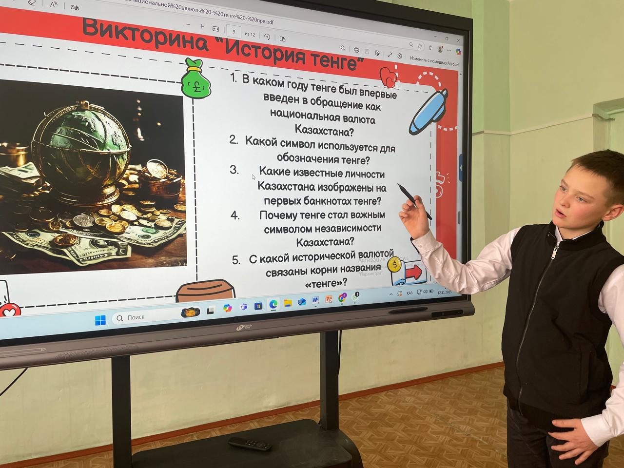 6-9 сыныптарда "ұлттық валюта күні"атты сынып сағаты өткізілді. Мақсаты: Оқушылардың Қазақстан Республикасының ұлттық валютасы-теңге туралы білімдерін кеңейту, оның пайда болу тарихымен, мемлекеттегі маңызы мен рөлімен таныстыру.